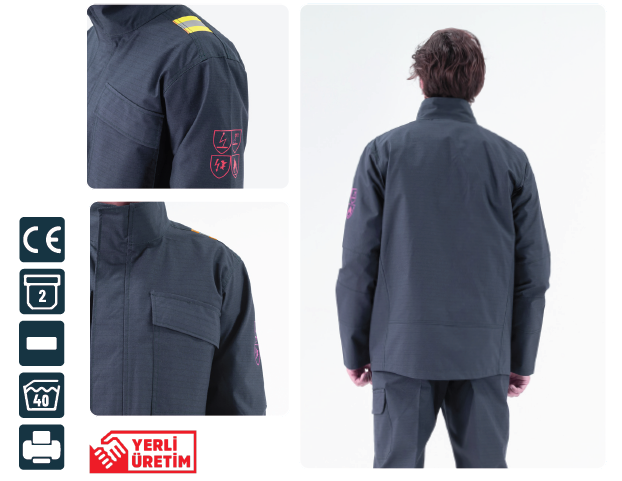 - CE Sertifikalı (EN ISO 13688:2015, EN ISO 11612:2015 A1A2B1C1E1F1, EN 1149-3:2004, EN ISO 11611:2015 CLASS 1, IEC 61482-2:2018 kA (APC = 1))